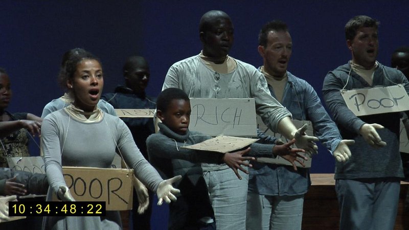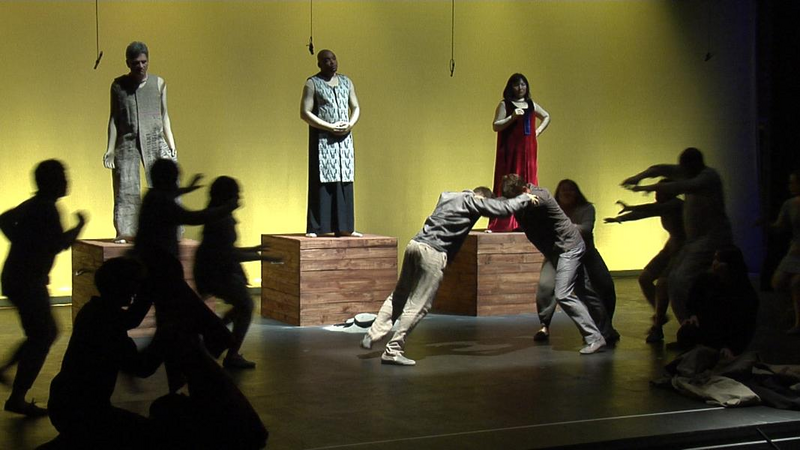 Im Hintergrund der Aufführung der "Chor", die mahnende "Stimme des Schöpfers". Denn mit der Kontrolle über das Feuer hat der Mensch begonnen, um Besitz und Macht zu kämpfen. Und so spielen sie im Stück auch ihre Rollen von "Macht und Ohnmacht, König und Bauer, Richter und Bettler", angelehnt an Pedro Calderóns "Gran teatro del mundo". Aber - ob Afrikaner, Asiate oder Europäer, ob arm oder reich, ob mächtig oder versklavt, am Ende fordert der "Schöpfer" (Chor) von jedem Rechenschaft über sein Tun, unabhängig von Status, Hautfarbe und Kultur.